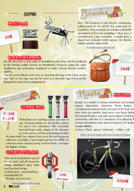 Brooks SHOPPING Multi -tool Over 700 members of the Brooks Community collaborated on the MT21, the multi-tool for travellers. This practical set includes a plentiful assortment of 21 tools including: 7 allen keys, 3 59€ screwdrivers, 3 torx wrenches, 4 spoke keys, a chain tool, a handy bottle opener, the Brooks Saddle spanner and a knife. www.brooksengland.com B3 LEATHER BAG For the first time a new range of moulded leather bags will be produced in the Brooks saddle factory in Smethwick, England, using the same machinery and techniques employed to make famous Brooks Leather 245€ Saddles. The B3 can be fitted on the bike by attaching the bag to the frame or the rear rack, or the bag may also be worn as a shoulder bag thanks to the detachable strap that accompanies it. Crankbrother Kuota KOUGAR impact. Innovative elements: Front brakes in GEM PUMPS Kougar is a model of strong emotional and technical aerodynamic position in the rear part of the fork, head S : 22€ tube with aero profile, dual pivot rear brake behind the bottom bracket, seat tube and seatpost modified in L : 27€ With their eye catching colors and ease of conformity with the UCI standards, thus allowing the use, the gem pumps are the perfect option correct installation of an internal battery DI2, bottom for entry level customers. The reversible bracket BB386. internal head easily adapts to fit schrader 3 colors : black - green/ dark-grey / white - red or presta valves, and the gem pumps include http://www.kuotacycle.it/en/content/kougar the same high/low volume function as the sterling pump collection. Available in two length options, the GEM S is a shorter, more compact pump, and the GEM L is longer for higher volume. CANDY 3 PEDALS Elite-level small platform pedal for xc, trail, and all mountain riding machined alloy body and cast steel wings. 4-sided entry / mud shedding / customizable fit 125€ * Weight: 314 g per pair per pair 3250€ www.crankbrothers.com 26 TRIhebdo