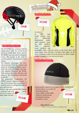 Wowow Dark Jacket 2.0 59,95€ 300€ Designed to fulfill your needs during your run; lightweight fluorescente jacket with relective parts for 360° visibility, BOOSTER ELITE 100% polyester, The BOOSTER was created in 2003 in water repellent and collaboration with the FrenchTrack breathable fabric, reflective parts on the front, back and and Field 4x100 Relay Team and the arms, zipper with reflection, 2 pockets with zipper on the BV SPORT research and Development front, ventilation under the arms and on the back. weight : Centre. The product is the result of 200 gr / Avalaible in man and woman style exertion-specific manufacturing tech- nology. Reflective Beanie The Booster encourages the verti- cal movement of the leg muscles and soleus by reducing oscillatory move- ment, the source of fatigue and mus- cular injuries. Moreover, the BOOS- TER reduces muscular vibration and improves the contraction and toning of muscles. The progressive compression BV SPORT patent) improves venous re- turn and promotes the oxygenation of muscles, tendons and ligaments during physical exertion, thus optimising athletic performance. Indispensable beanie for any runner or biker in the dark! Regular wear delays the sensation of heavy legs and considerably reduces • Stretch fabric for a perfect fit cramping. The BOOSTER still allows a normal sock to be worn. • Thermal isolation Used in conjunction with our range of recovery socks, you • Fleece fabric on the inside 19,95€ can be sure of carrying out your activities under the best • Reflective band around physiological conditions. 55,50€ • Breathable function • Available in 1 size More informations : http://www.bvsport.com More informations : http://www.accessoires-running.com/ 35 TRIhebdo
