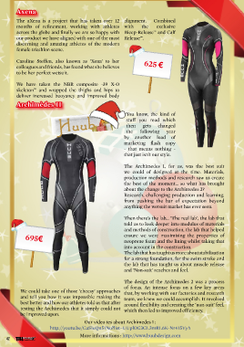 Axena The aXena is a project that has taken over 12 alignment. Combined months of refinement, working with athletes with the exclusive across the globe and finally we are so happy with Bicep-Release™ and Calf our product we have aligned with one of the most Release™. discerning and amazing athletes of the modern female triathlon scene. Caroline Steffen, also known as ‘Xena’ to her 625 € colleagues and friends, has found what she believes to be her perfect wetsuit. We have taken the NBR composite -39 X-O skeleton™ and wrapped the thighs and hips to deliver increased buoyancy and improved body Archimèdes II Huub You know, the kind of stuff you read which then changed gets year following the by another load of marketing flash copy - that means nothing - that just isn’t our style. The Archimedes 1, for us, was the best suit we could of designed at the time. Materials, production methods and research saw us create the best of the moment... so what has brought about the change to the Archimedes 2? Research, challenging production and learning, from pushing the bar of expectation beyond anything the wetsuit market has ever seen. Then there’s the lab... ‘The real lab’, the lab that told us to look deeper into modulus of materials and methods of construction, the lab that helped 695€ ensure we were maximising the properties of neoprene foam and the lining whilst taking that into account in the construction. The lab that has taught us more about stabilisation for a strong foundation, for the swim stroke and the lab that has taught us about muscle release and ‘Non-suit’ reaches and feel. The design of the Archimedes 2 was a process of focus. An intense focus on a few key areas We could take one of those ‘cheesy’ approaches that, by working with our factories and research and tell you how it was impossible making the team, we knew we could accomplish. It revolved best better and how our athletes told us that after around flexibility and creating the ‘non-suit’ feel, testing the Archimedes that it simply could not which then led to improved efficiency. be improved upon. Our video tes about Archimedes 1 : http://youtu.be/GaS1eQn5INo?list=UUplOG3GL3mRL6K-Nr4I5VyA More informations : http://www.huubdesign.com 42 TRIhebdo