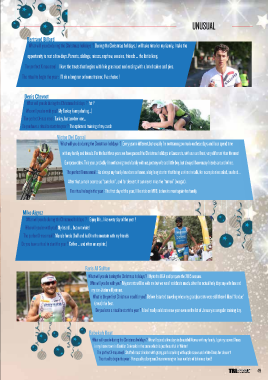 UNUSUAL Bertrand Billard What will you do during the Christmas holidays ? During the Christmas holidays, I will take time for my family, I take the opportunity to rest a few days. Parents, siblings, nieces, nephew, cousins, friends ... the list is long. The perfect X-mas meal : I love the treats that begins with foie gras toast and ending with a lot of cakes and pies. The ritual to begin the year : I’ll do a long run or home trainer, I’ve choice ! Denis Chevrot What will you do during the Christmas holidays ? fat ! Who will you be with you? My Turkey (sorry darling...) The perfect X-mas meal : Turkey, but another one... Do you have a ritual to start the year ? The optionnal training of my coach Victor Del Corral What will you do during the Christmas holidays ? Every year is different, but usually I’m not training so much on these days and I can spend time with my family and friends. For the last three years we have passed the Christmas holidays in Lanzarote, with sun and heat, very different than the most European cities. This year, probably I’m not having much family with me, just my wife and little boy, but always I have many friends around of me. The perfect X-mas meal : As always my family has done at home, a big long starter that bring us time to talk, for example nice salad, seafood... After that, a main course as “canelloni”, and for dessert, it can never miss the “turron” (nougat). The ritual to begin the year : The first day of the year, I like ride on MTB, before to meet again the family. Mike Aigroz What will you do during the Christmas holidays ? Enjoy life... like every day of the year ! Who will you be with you? My beard ... but not white! The perfect X-mas meal ? Manu’s fondu (half and half) in the moutain with my friends Do you have a ritual to start the year ? Coffee ... and often an aspirin;) Faris Al Sultan What will you do during the Christmas holidays ? I fly to the UEA and prepare the 2015 season. Who will you be with you? My parents will be with me but we won’t celebrate much, after the actual holy days my wife Ina and my son Jasim will join me. What is the perfect Christmas meal for you? Before I started traveling when my grandparents were still there I liked “fondue” (meat) the best. Do you have a ritual to start the year ? I don’t really celebrate new year even so the 1st of January is a regular training day. Rebekah Keat What will you do during the Christmas holidays ? We will spend a few days in beautiful Noosa with my family. I get my second Xmas in my home town in Boulder Colorado in the snow which is just beautiful in Winter! The perfect X-mas meal : Stuffed roast chicken with gravy, pork cracking with apple sauce and white Xmas for dessert! The ritual to begin the year : Yes usually a long run Xmas morning so I can eat lots of delicious food!! 49 TRIhebdo
