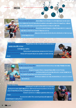 UNUSUAL Craig Alexander What will you do during the Christmas holidays ? Christmas Holidays this year will be spent at home with the family. Summer in Australia means lots of time at the beach and in the pool. On Christmas Day itself, we will catch up with extended family. Most of the Christmas Holidays, I will be with Neri, Lucy, Austin and LANI. We will also catch up with my Mum and brother and his family as well as Neri’s family. What is the perfect Christmas meal for you ? Personally, I love seafood for Christmas lunch and dinner. Christmas in Australia is in summer, so it is usually a blistering hot day. No hot food for me. And I’ll always have a beer or two. Do you have a ritual to start the year ? I always get up and train very early on New Years Day. Usually a bike ride with some friends. A great way to get the ball rolling for the new year. Caroline Steffen What will you do during the Christmas holidays ? I’ll spend Christmas in Australia, which means catching up with family friends and hopefully a few Aussie BBQ’s at the beach. Who will you be with you ? David’s family and our dog Monty What is the perfect Christmas meal for you ? Christmas turkey with mango/avocado/prown salad and some cold cider’s to stay cool Do you have a ritual to start the year ? We always start the new year with a long ride and a big breakfast at our favourite coffee shop afterwards Luke MacKenzie What will you do during the Christmas holidays ? I am usually in Australia for Christmas but this year I am traveling to Philadelphia with my family. Possibly my first ever white’ Christmas. Who will you be with you ? This year it will be my partner Beth and our baby daughter Wynne and Beth’s family from Philadelphia. What is the perfect Christmas meal for you ? I love Christmas in Australia as it is summer time and the weather is very nice. Our family likes to eat some seafood like Prawns and Oysters as well as cold cuts of meat like Ham and Turkey. Do you have a ritual to start the year ? New Year day was traditionally a nice morning ocean swim and a long run. I am not sure if I can follow the same routine this year. Albert Roberto Mollins What will you do during the Christmas holidays ? I tried to do my normal train and the social events with the family. I think doing the two things is the best options. Enjoy the family and the train, and don´t worried if one day it´s not possible to do all the train in the program. I will stay with my family, friends, and girlfriend during the events with the family. What is the perfect Christmas meal for you ? Canalones it´s my perfecte meal , it´s cooking by my grandmother and there are really really good. Do you have a ritual to start the year ? Yes, normally I went to walk for 2/3 hours and saw the pace (because all of people went late to the bed) during this first morning of the year 50 TRIhebdo