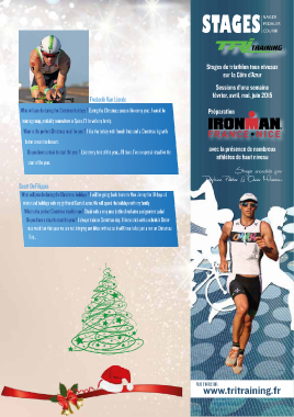 NAGER PEDALER STAGES COURIR Stages de triathlon tous niveaux sur la Côte d’Azur Sessions d’une semaine février, avril, mai, juin 2015 Frederik Van Lierde What will you do during the Christmas holidays ? During the Christmas season like every year, I would be Préparation training camp, probably somewhere in Spain. I’ll be with my family. What is the perfect Christmas meal for you ? I like the turkey with french fries and a Christmas log with butter cream for dessert. avec la présence de nombreux Do you have a ritual to start the year ? Like every time of the year... I’ll train. I’ve no special ritual for the athlètes de haut niveau start of the year. Stages encadrés par Delphine Pelletier & Olivier Marceau Scott DeFilippis What will you do during the Christmas holidays ? I will be going back home to New Jersey for 10 days of winter and holidays with my girlfriend Carrie Lester. We will spend the holidays with my family. What is the perfect Christmas meal for you? Steak with a very nice bottle of red wine and gourmet salad Do you have a ritual to start the year ? I always train on Christmas day. I like to stick with a schedule Christ- mas week but this year we are not bringing our bikes with us so it will have to be just a run on Christmas PMS BLACK PMS 1797C PMS PMS PMS PMS Day... PLUS D’INFOS SUR : www.tritraining.fr