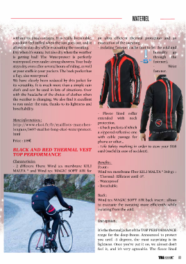 MATERIEL without its disadvantages. It is really breathable, an ultra efficient thermal protection and an you don’t feel stifled when the sun goes out, and it evacuation of the sweating. allows to stay dry while evacuating the sweating. - Isolating fastener cache (not to let the cold and Dry when it’s sunny, but also dry when the weather humidity go is getting bad! The Waterprotect is perfectly through the waterproof, even under strong showers. Your body fastener). stays dry, even after several hours of riding, as well - Wrist as your stuffs in your pockets. The back pocket has fastener. a flap, also waterproof. We have clearly been seduced by this jacket for its versatility. It is much more than a simple rain cloth and can be used in lots of situations. Over with the headache of the choice of clothes when the weather is changing. We also find it excellent to run under the rain, thanks to its lightness and breathability. - Fleece lined collar More informations : extended with neck http://www.ekoi.fr/fr/maillots-manches- protection. longues/3497-maillot-long-ekoi-waterprotect. - 4 back pockets of which html a zippered reflective one with cable passage for Price : 139€ phone or other... - Life Safety marking in order to stow your SOS BLACK AND RED THERMAL VEST card (useful in case of accident). TOP PERFORMANCE Characteristics: Benefits : - 2 different fibers: Wind tex membrane KILI Front : MALTA ® and Wind tex MAGIC SOFT AIR for Wind tex membrane fiber KILI MALTA ® 360 gr. : - Thermal : Efficient until -5°. - Waterproof - Breathable. Back : Wind tex MAGIC SOFT AIR back insert : allows to evacuate the sweating more efficiently while isolating from the cold. Our opinion : It’s the thermal jacket of the TOP PERFORMANCE range for the deep-freeze. Announced to protect you until -5 degrees, the most surprising is its lightness. Once you’ve put it on, we almost don’t feel it, and it’s very agreeable. The fleece lined 63 TRIhebdo