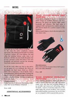 MATERIEL BLACK WINTER GLOVES EKOI ALLOY 2014 These gloves integrate an aluminum membrane which brings an excellent thermal protection. Moreover, the gloves are flexible, light, warm, breathable and reflective. The hand palm is equipped with 5 gel inserts for comfort and non- skid silicone inserts for a perfect support of the handlebar. Efficient until 0 degree, they’re the ideal gloves for your winter rides. collar goes up very high without strangling. On the road, this jacket completely protects against the cold, nothing goes through! Everything is perfectly isolated, the wrist fastener, the long collar, the isolating fastener cache, there is no fresh air at all that can enter inside the jacket. But it’s not a pressure cooker, the jacket is also very breathable and perfectly evacuate the sweating. Your body remains warm and dry. More informations : To tell the truth, when you look at the jacket, http://www.ekoi.fr/fr/gants-hiver/3478-gants- we can guess it’s very technical, the fibers are hiver-ekoi-alloy-2014.html developed, the back insert Wind tex MAGIC SOFT AIR is impressive. A lot of details make a Price : 35€ good impression, with the Life Safety marking, the zipped pocket with a cable passage for the phone, a collar with fleece lining... All these promises are BLACK NEOPRENE OVERSHOES kept on the road! EKOI C3 2014 Plus d’informations : 4mm neoprene overshoes, announced efficient http://www.ekoi.fr/fr/vestes-thermiques/3495- until 0 degree. Ideal for your cold and humid veste-ekoi-top-performance-2014.html winter rides. You close the overshoes thanks to an invisible and waterproof self-locking zipper. Price : 169€ To finish, a system of fastening adjustable at the ankle makes the overall overshoes more isolated ADDITIONAL ACCESSORIES and avoids humidity to penetrate. Be careful, they are not compatible with mountain bike practice. 64 TRIhebdo