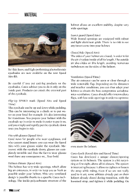 MATERIAL helmet allows an excellent stability, despite very wide openings. Insect guard (Speed Airo) Wide frontal openings are equipped with robust and light aluminum grids. There is no risk to see any insect come into your helmet. Closed Side (Speed Airo) The sides of your helmet are closed, in order to let the air circulate inside of all its length. The outside air also slides on this length, avoiding numerous turbulences on the sides of the helmet. for thin faces, and high-performing photochromic eyeshades are now available on the new Speed Airo RS. Ventilation (Speed Time) The air entrance can be open or close through a Be careful: if you put anti-fog products on the wide removable flap. Depending on the distances eyeshades, Casco advises you to do it only on the and weather conditions, you can thus adapt your inside part. Products can attack the external part helmet to obtain the best compromise aerodyna- of the eyeshade. mics-ventilation. Casco should offer intermediary flaps, with less wide openings in order to optimize Flip-Up SPEED mask (Speed Airo and Speed Time) The eyeshade can be up and down while pedaling. This can be interesting in a climb, or to put wa- ter on your head for example. It’s also interesting for transitions. You prepare your helmet with the eyeshade up in order to make it easier to put it on, and you simply and rapidly put the eyeshade down once you begin to ride. Fits with glasses (Speed Airo) Good news for people who wear eyeglasses, and who cannot stand lenses: you can wear the Speed Airo with your glasses under the eyeshade. Mo- even more the helmet. reover, with the eyeshade down, glasses are com- pletely invisible and thus the fact to wear glasses Casco Lock (Speed Airo and Speed Time) won’t have any consequence on... Your look! Casco has developed a unique closure/opening system on its helmets. The system is a bit surpri- Helmet climate (Speed Airo) sing at first sight, above all its closure. The system The helmet has very wide openings, which allow is interesting because it allows to tighten or loosen big air entrances, in order to keep you as fresh as the strap while riding. Even if we are not really possible under your helmet. This very ventilated used to it yet, some athletes already put on their design is possible thanks to a specific Casco tech- helmet already closed during transition, with the nology. The inside polycarbonate structure of the loosened strap, and tighten it while pedaling. On 72 TRIhebdo