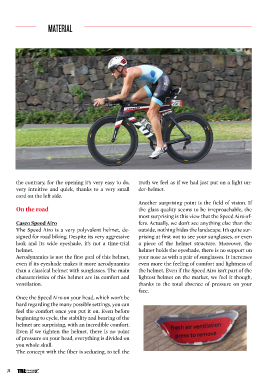 MATERIAL the contrary, for the opening it’s very easy to do, truth we feel as if we had just put on a light un- very intuitive and quick, thanks to a very small der-helmet. cord on the left side. Another surprising point is the field of vision. If On the road the glass quality seems to be irreproachable, the most surprising is this view that the Speed Airo of- Casco Speed Airo fers. Actually, we don’t see anything else than the The Speed Airo is a very polyvalent helmet, de- outside, nothing hides the landscape. It’s quite sur- signed for road biking. Despite its very aggressive prising at first not to see your sunglasses, or even look and its wide eyeshade, it’s not a time-trial a piece of the helmet structure. Moreover, the helmet. helmet holds the eyeshade, there is no support on Aerodynamics is not the first goal of this helmet, your nose as with a pair of sunglasses. It increases even if its eyeshade makes it more aerodynamics even more the feeling of comfort and lightness of than a classical helmet with sunglasses. The main the helmet. Even if the Speed Airo isn’t part of the characteristics of this helmet are its comfort and lightest helmet on the market, we feel it though, ventilation. thanks to the total absence of pressure on your face. Once the Speed Airo on your head, which won’t be hard regarding the many possible settings, you can feel the comfort once you put it on. Even before beginning to cycle, the stability and bearing of the helmet are surprising, with an incredible comfort. Even if we tighten the helmet, there is no point of pressure on your head, everything is divided on you whole skull. The concept with the fiber is seducing, to tell the 74 TRIhebdo