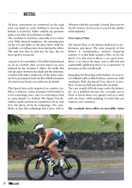 MATERIAL All these impressions are confirmed on the road 250euros with the eyeshade (around 300euros for once you begin to cycle. Nothing is moving, the the RS version), it’s the price to pay for the «Rolls» helmet is incredibly stable without any pressure of the helmets! point, even after several hours of effort. The eyeshade is excellent, especially if you sweat Casco Speed Time a lot. With classical sunglasses, the sweating goes on the rim and slides on the glass. Here, with the The Speed Time is the helmet dedicated to per- eyeshade, everything stays clean during the effort. formance and speed. The main property of this The only fear that we had was the fog... But we helmet is aerodynamics, without forgetting were quickly reassured. comfort. It is also built around a fiber. As for the Speed Airo, this system allows a very good circu- Last point, the ventilation. If the fiber had seduced lation of air above the head, and an efficient and us for its comfort, after several meters we were comfortable tightening thanks to a repartition of seduced by the aeration it offers. We really feel pressures on the overall skull. this air space between the skull and the structure, coupled with wide ventilations of the Speed Airo, Regarding the threading of the helmet, it’s very of- we feel a permanent fresh air flux which circulates ten difficult with profiled helmets, moreover with all around your head, even when we go slowly. eyeshades. With this Speed Time, there is no pro- blem, if you carefully put down the eyeshade. This Speed Airo really surprised us: comfort, sta- The ears, usually difficult to put under the helmet, bility, ventilation, vision, nothing is left behind. It’s are not a problem because the eyeshade covers a real technology jewel, and it’s surprising to find them. It can be down very quickly and very easily so many details in a helmet. The Speed Airo de- with one hand, while pedaling. It could help you cidedly stands out from its competitors, by its look improve your transition. first, but above all by its technology. The «pro- blem» is that this technology has a price, 200 or The eyeshade down offers an incredible vision 76 76 TRIhebdo TRIhebdo