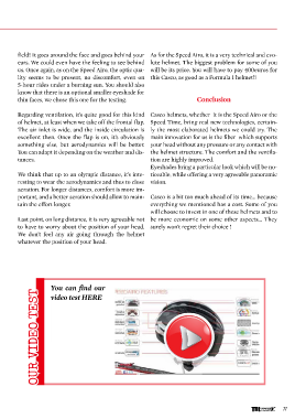 field! It goes around the face and goes behind your As for the Speed Airo, it is a very technical and evo- ears. We could even have the feeling to see behind lute helmet. The biggest problem for some of you us. Once again, as on the Speed Airo, the optic qua- will be its price. You will have to pay 400euros for lity seems to be present, no discomfort, even on this Casco, as good as a Formula 1 helmet!! 5-hour rides under a burning sun. You should also know that there is an optional smaller eyeshade for thin faces, we chose this one for the testing. Conclusion Regarding ventilation, it’s quite good for this kind Casco helmets, whether it is the Speed Airo or the of helmet, at least when we take off the frontal flap. Speed Time, bring real new technologies, certain- The air inlet is wide, and the inside circulation is ly the most elaborated helmets we could try. The excellent then. Once the flap is on, it’s obviously main innovation for us is the fiber which supports something else, but aerodynamics will be better. your head without any pressure or any contact with You can adapt it depending on the weather and dis- the helmet structure. The comfort and the ventila- tances. tion are highly improved. Eyeshades bring a particular look which will be no- We think that up to an olympic distance, it’s inte- ticeable, while offering a very agreeable panoramic resting to wear the aerodynamics and thus to close vision. aeration. For longer distances, comfort is more im- portant, and a better aeration should allow to main- Casco is a bit too much ahead of its time... because tain the effort longer. everything we mentioned has a cost. Some of you will choose to invest in one of these helmets and to Last point, on long distance, it is very agreeable not be more economic on some other aspects... They to have to worry about the position of your head. surely won’t regret their choice ! We don’t feel any air going through the helmet whatever the position of your head. You can find our OUR VIDEO TEST video test HERE 77 TRIhebdo