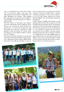 COUP DE PROJO vence, a wonderful lake site where the Ironman tensive training courses were held in Font-Romeu 70.3 Aix-en-Provence edition took place, The (Pyrénées, France) and Callella (Spain). Durance club organised it first triathlon in September 2014 Triathlon participated in many events, nationna- called “Remember Guy Drumez”. They nammed ly (Aix 70.3, Alpe d’Huez, Embrun, the Verdon, this competition in the memory of Guy Drumez, a Mont-Tremblant) and internationnaly (Barcelona young triathlete who died tragically in a traffic ac- and Majorca). cident in 2012. In 2015, Durance Triathlon will continue to grow This first edition of “Remember Guy Drumez” and pursue his activities. Two training courses will event was organized by Caroline Schattens, Sports be held in February and April. We are preparing the Director, and seconded by David Drumez, Ra- 2nd edition of the event “Remember Guy Drumez”, cing Director. It attracted in two days more than with the same competitions as the 1st edition, plus 500 competitors in the four competitions: a child an extra triathlon race against time trial. We are aquathlon, a foot race female run, and two triath- very proud to have excellent promising regional lons (distance XS “Animathlon Triathlon” and dis- triathletes joining the ranks of Durance Triathlon tance S “Triathlon”). on a regular basis. We are also delighted that our In its first year, Durance Triathlon as won the trust many members from our first year are still conti- and support of many local partners (Intercode Ser- nuing to trust us, such as Arnaud Clement, captain vices, Aggregates Durance, Bayern BMW, Efidia, of France’s Davis Cup (who attracts fans on a regu- Powersport). The club has travelled a lot: two in- lar basis wherever he loads his material...) Marcel Zamora when he signed his 5 time victory. 9 TRIhebdo