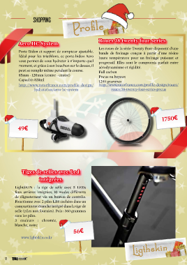Profle SHOPPING Roues 38 twenty four series Aero HC System Les roues de la série Twenty Four disposent d’une Porte Bidon et support de compteur ajustable. bande de freinage conçue à partir d’une résine Idéal pour les triathlons, ce porte-bidon Aero haute température pour un freinage puissant et vous permet de vous hydrater à n’importe quel progressif. Elles sont le compromis parfait entre moment, et grâce à son bouchon sur le dessus, il aérodynamisme et rigidité. peut se remplir même pendant la course. Full carbon 85mm - 120mm (centre - centre) Pneus ou boyaux Capacité: 828ml 1299 grammes http://www.rotorfrance.com/profile-design/ http://www.rotorfrance.com/profile-design/roues/ hydratation/aero-hc-system roues/38-twenty-four-series-pneus 1750€ 49€ Tiges de selles avec Led intégrées LightSKIN : la tige de selle avec 5 LEDs feux arrières intégrées, 10 modes différents de clignotement via un bouton de contrôle. Fonctionne avec 2 piles LR6 cachées dans un compartiment étanche intégré dans la tige de selle (piles non fournies). Pois : 360 grammes sans les piles. 3 couleurs : chromée, blanche, noire 56€ www.lightskin.co.kr Ligthskin 12 TRIhebdo