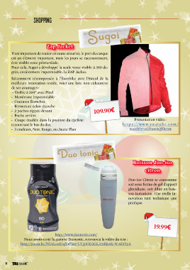 SHOPPING Sugoi Zap Jacket Il est important de rouler en toute sécurité; le port du casque est un élément important, mais les jours se raccourcissant, être visible reste primordiale. Pour cela, Sugoi a développé la seule veste visible à 360 de- grés, entièrement imperméable; la ZAP Jacket. Récemment récompensée à l’Eurobike avec l’Award de la meilleure innovation textile, voici une liste non exhaustive de ses avantages : - Visible à 360° avec Pixel - Membrane imperméable - Coutures Étanches - Fermeture éclair étanche - 2 poches zippée devant 109.90€ - Poche arrière - Coupe étudiée dans la position du cycliste Présentation vidéo : recouvrant le bas du dos. https://www.youtube.com/ - 3 couleurs, Noir, Rouge, ou Jaune Fluo watch?v=eGPuwAQFRmw Duo tonic Boisson duo-iso citron Duo-Iso Citron se consomme soit sous forme de gel d’apport glucidique, soit dilué en bois- son isotonique. Une réelle in- novation tant technique que pratique. 19.99€ http://www.duotonic.com/ Nous avons testé la gamme Duotonic, retrouvez la vidéo du test : http://youtu.be/NUsLoxEtqY4?list=UUplOG3GL3mRL6K-Nr4I5VyA 14 TRIhebdo