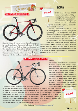 Canyon SHOPPING 5699€ CF TT et de l’Ultimate CF SLX AEROAD CF SLX 9.0 SL pour créer un cadre de 980g. Le résultat est un vélo qui rassemble le meilleur aérodynamisme avec les paramètres classiques qui rendent un vélo performant : rigidité maximale, légèreté, maniabilité exceptionnelle et confort. Le nouvel Aerocockpit CF était au cœur du développement et incarne l’intégration systématique des composants clés pour améliorer la performance globale. La rigidité accrue du boitier de pédalier est évidente lors des sprints, tandis que celle de la douille de direction rend les descentes rapides plus L’Aeroad incarne la course dans sa forme la plus pure. sures. Une position de pilotage agressive La première place du classement individuel de l’UCI obtenue par notre Pro Geometry signifie que le coureur WorldTour, trois ans d’affilée et des victoires dans les va plus vite avec moins d’effort pour se préserver plus grandes courses du monde sont la preuve de son jusqu’au moment opportun pour attaquer. L’Aeroad CF talent. Entièrement revu, l’Aeroad CF SLX a prouvé sa SLX excelle et réussit le pari d’élever la performance vitesse avec deux victoires d’étape sur le Tour de France. globale d’un vélo de route. Canyon a pris les meilleurs attributs du Speedmax ULTIMATE CF SLX 9.0 latérale. La dernière génération de tube de selle Maximus dispose d’un design sculpté pour permettre un flex optimisé pour plus de confort et se combine également avec le boitier de pédalier PressFit et les bases asymétriques pour garantir un transfert de puissance à 100%. La fourche One One Four SLX, tout carbone, utilise également la technologie VCLS pour réduire les impacts et les vibrations de manière à emmagasiner un maximum d’énergie avant le sprint final. Le Sport Pro L’Ultimate CF SLX est annoncé par la marque comme Geometry permet au coureur de trouver un des plus beaux et efficace cadre carbone de route la position idéale sur le vélo et de la production actuelle. Elu vélo de l’année en 2013 d’optimiser la performance et et 2014, le cadre ne pèse que 790 g, il impose de le confort lors des nombreuses nouvelles normes grâce à la combinaison de son faible heures en selle. L’Ultimate CF 3899€ poids, sa grande rigidité, son confort, le tout autour SLX se positionne comme le dans un design épuré. Les haubans et leur technologie vélo parfait pour les pros et les sophistiquée VCLS viennent se connecter directement amateurs. avec le tube horizontal pour garantir une forte rigidité Plus d’infos sur : http://www.canyon.com/fr/ 21 TRIhebdo