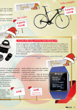 Look Vélo complet Di2, routage 100% intégré… toutes les parties du 795 Aerolight A partir ont été minutieusement étudiées pour vous offrir cette machine hors du commun. 6499€ 2 versions disponibles : AEROLIGHT (freins intégrés) et LIGHT (freins traditionnels) Kit cadre Intégration poussée à son maximum : potence Aerostem, nouvelle tige de selle E-Post 2, freins, pédalier Zed 2, fourche HSC8 A partir 5299€ 3 coloris : blanc, carbone/rouge, fluo reflect Polar CAPTEUR DE PUISSANCE KEO POWER Rendre la puissance accessible, telle est la promesse faite par Look et Polar avec cette nouvelle Keo power Essential. La mesure se fait sur une seule jambe et permet de déduire la puissance dégagée pour améliorer votre façon de pédaler et gagner en efficacité. La KEO power essential est compatible avec la V800 et le V650 dans la gamme Polar. La mesure est possible sur les 2 jambes avec la Keo Power Bluetooth. http://www.polar.com/fr/produits/accessoires/keo_power_bluetooth_ smart Polar V800 Un cardio-GPS haut de gamme pour des mode triathlon avec temps de transition, athlètes exigeants. Il intègre un tracker analyse la nage extérieure (GPS + cardio) d’activité pour la gestion et l’optimisation et intérieure (cardio) de la récupération • Tracker d’activité : Suivi de l’activité • Vitesse, distance, et localisation physique 24/7, analyse l’effet de l’activité • Fonction retour au point de départ quotidienne sur la récupération, calcule • Itinéraires téléchargeables les calories dépensées dans la journée • Planification de parcours • Altimètre barométrique • 2 modes d’autonomie : 14h/50h • Enregistrement RR 449€ (battements/battements) 399€ avec émetteur de • Fonctions uniques Polar fréquence cardiaque de Smart Coaching • Adapté à la natation et au triathlon : Waterproof 30m, 23 TRIhebdo
