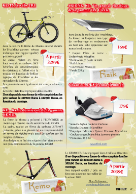 KE-T5, le vélo TRI ARIONE K3: Un grand classique de la gamme Tri f’izi:k. Sans doute la préférée des Triathlètes. Sa forme, sa longueur, son type de rembourrage et revêtement Avec le KE-T5 la firme de Monza entend séduire en font une selle appréciée sur 169€ les Triathlètes par son niveau toutes les distances. technique et un rapport qualité/ * Coque: Fibre de verre - prix très agressif. A partir Technologie Wingflex Le cadre, réalisé en fibre 2299€ * Rembourrage haute densité haut module et carbone 3KT * Rail: k:ium bénéficie de caractéristiques * Couverture: Microtex de résistance à l’effort et à la * Poids: 235 g tension en fonction de l’effort Fizik typique du Triathlète et du spécialiste du Chrono. Les géométries ont également été conçues dans ce Chaussures K5 Donna (femme) sens. Le KEMO KE-T5 est proposé dans 4 tailles Il est disponible sous forme de vélo complet dont les prix varient de 2299.00 Euros à 3229,00 Euros, en fonction du montage. 179€ KE – R4, le dernier né de la gamme KEMO. La firme de Monza a présenté à l’EUROBIKE un modèle qui résume tout le savoir faire de KEMO. * Semelle Nylon renforcé Carbone Le cadre, réalisé en fibres de carbone 30T/40T * Boucle: Diamant Microfiber présente, grâce à sa géométrie, un compromis idéal * Empeigne: Microtex Nylon + Diamant Microfiber en terme de rigidité mais aussi de confort sur les * Couleur argent blanc bleu (comme photos) longues distances. * Pointures: 36 à 43 Son design et sa finition soignée n’ont rien à envier aux plus hauts modèle de la gamme KEMO. www.fizik.com Le KEMO KE- R4 est proposé dans 6 tailles différentes Il est disponible sous forme de vélos complets dont les prix varient de 2039.00 Euros à 3519,00 Euros, en fonction du montage. A partir Son rapport qualité / prix en 2039€ fera sans doute un best seller de la saison 2015 Kemo www.kemobikes.com Plus d’infos sur : TRIhebdo 27