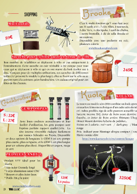 Brooks SHOPPING Multi outils C’est le multi-fonction qu’il vous faut avec ses 21 outils en 1 : 7 clés Allen, 3 tournevis, 3 clés Torx, 4 clés Spoke, 1 outil de chaîne, 1 ouvre bouteille, 1 clé de selle Brooks et 59€ un couteau. Disponible avec une pochette en cuir, plusieurs coloris www.brooksengland.com Sacoche pour cycliste aussi en tenue de ville… Bon nombre de triathlètes se déplacent à vélo et pas uniquement à l’entraînement. Cette sacoche en cuir véritable a été conçue pour tous ceux qui se déplacent à vélo et qui en ont marre du look écolier sac à 245€ dos… Conçues pour de multiples utilisations, ces sacoches de différentes tailles (ici présenté le modèle le plus large), elles se fixent sur le vélo ou se portent tant à la ceinture qu’en bandoulière. Un cadeau original pour ces fêtes de fin d’année. Crankbrother Kuota KOUGAR et tous les éléments techniques d’un cadre aéro dernier GEM POMPES Le nouveau modèle aéro 2015 combine un look agressif cri : tubes profilés, tige de selle pouvant accueillir une S : 22€ batterie interne Di2, étrier de frein avant derrière la fourche, et étrier de frein arrière Shimano Ultegra L : 27€ Avec leurs couleurs accrocheuses et leur Direct Mount derrière la boite de pédalier… facilité d’utilisation, les gem pompes sont Existe en 3 coloris : noir-vert / dark-grey / blanc- l’option parfaite rapport qualité/prix. La rouge tête interne réversible s’adapte facilement Prix indiqué pour Montage ultegra compact / roues aux vannes Schrader ou Presta. Disponible Mavic cosmic elite en deux options de longueur, le GEM S est une pompe http://www.kuotacycle.it/en/content/kougar plus courte, plus compacte, et le GEM L est plus longue pour un volume plus élevé. Disponible en argent, rouge et vert PEDALES CANDY 3 Produit VTT ideal pour les Xterra * Axe Acier Cromoly forgé * Corps aluminium usiné CNC * Ressort et ailes Acier Inox * Poids: 314 g la paire 125€ 3250€ La paire www.crankbrothers.com 28 TRIhebdo