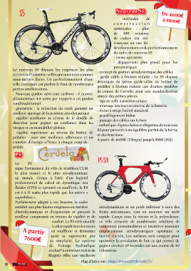 Nouveau S5 De 4600€ - méthodes de à 8800€ cons truct ion optimisées : plus de 100 versions de cadres ont été concçues en vue du développement et du perfectionnement du cadre du nouveau S5 - forme optimisée - dégagement plus grand pour les pneumatiques Le nouveau S5 dépasse les exigences les plus - concept de gestion aérodynamique des câbles strictes de l’industrie : celles que nous nous sommes - guide câble à friction réduite : Le S5 dispose nous-mêmes fixées. Un perfectionnement d’une désormais du même guide-câble du boîtier de telle envergure est parfois le fruit de nombreuses pédalier à friction réduite que d’autres modèles petites améliorations. de course de Cervélo, pour une standardisation - Nouveau guidon aéro tout carbone : il permet simple des petites pièces. d’économiser 4,4 watts par rapport à un guidon - tige de selle à position unique rond traditionnel - montage internet et externe de la batterie - géométrie : la réduction du stack garantit un - freins à tirage latéral standard meilleur ajustage de la position aérodynamique - grand logement bidon - rigidité améliorée au niveau de la douille de - passage des câbles sur la base direction pour gagner en confiance dans les - esthétique : lignes claires et élégantes du nouveau virages et en maniabilité globale S5 pour parvenir à un équilibre parfait de la forme - rigidité supérieure au niveau du boitier de et des fonctions. pédalier : pour une meilleure adhérence et un A partir de 4600€ (Ultegra) jusqu’à 8800 (Di2) transfert d’énergie efficace à chaque coup de pédale Cervelo P5 Le P5 signe l’avènement du vélo de triathlon/CLM le plus avancé et le plus aérodynamique au monde. Conçu à l’aide d’un logiciel professionnel de calcul de dynamique des fluides (CFD) et éprouvé en soufflerie, le P5 est 6 à 11 watts plus rapide que les autres « superbikes ». Parfaitement adapté à vos besoins, le cadre satisfait aux plus hautes exigences en matière aérodynamique et un poids inférieur à ceux des d’aérodynamique et d’ergonomie et garantit le freins mécaniques, tout en assurant un arrêt meilleur compromis en termes de rigidité et de rapide. Conçu pour la vitesse et la polyvalence, confort. Le P5 est le modèle ce vélo présente de nombreuses solutions de le plus rapide lors des essais rangement personnalisées et intuitives associant A partir en soufflerie et démontre emplacements aérodynamiques optimaux et 7600€ aussi sa supériorité par facilité d’accès. Les surfaces sont conçues pour sa simplicité. Le système optimiser la circulation de l’air, ce qui permet de de freinage hydraulique gagner environ 30 secondes sur une course de 40 exclusif à entretien réduit de kilomètres. Magura offre une meilleure Plus d’infos sur : http://www.cervelo.com/fr/ 30 TRIhebdo