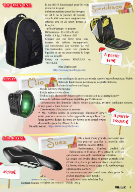 Sportsbags ‘OO’ ONLY ONE le sac 100 % fonctionnel pour les voyages, le travail et le sport Solution parfaite pour les voyages de 48 h ou la journée de travail. Avec le OO vous avez toujours vos affaires pro et de sport prêtes à l’emploi. Taille de laptop : 14 pouces Dimensions : 45 x 32 x 24 cm Poids : 1.9 kg / Volume : 30 l Chaque sac est livré avec une trousse de toilette transparente, qui correspond aux normes de vol internationales pour les produits liquides et un sac pour mettre le linge sale ou mouillé. A partir Existe en version REGULAR et 149€ TROLLEY Plus d’infos sur : http://www.agsportbags.com/ Mio ALPHA Le premier moniteur cardiaque de sports au monde sans ceinture thoracique. Fiable conçu pour les athlètes de haut niveau des niveaux de performances. - Surveillance continue du rythme cardiaque - Pas de ceinture thoracique - Précis même à vive allure - Technologie Bluetooth® Smart (4.0) se connectant aux smartphones** - Zones de rythmes cardiaques réglables par l’utilisateur - Consultation des données (durée totale d’exercice, rythme cardiaque moyen, temps passé « dans la zone ») - Chronomètre d’exercices et montre ** Moi ALPHA utilise la technologie Bluetooth® Smart (4.0) pour se connecter à des appareils compatibles. Une A partir large gamme d’apps de mise en forme sont actuellement 169.95 € disponibles pour les iPhone 5 et 4s. Plus d’infos sur : http://www.mioglobal.com/ Suez l’on pourrait qualifier la nouvelle selle Selle ROYAL Elle a tout d’une grande, c’est ainsi que ROYAL modèle SUEZ. Performance, Confort, Qualité de Fabrication et Finition, Prix attractif, voilà ce qui résume cette selle du fabricant vénitien. La coque est évidée dans sa partie centrale afin d’éviter les pics de pression au niveau du périnée. La forme même de cette coque et le rembourrage optimisent le confort. 49,90€ La couverture est une combinaison d’un grain fin Infos: et d’un matériau «soft touch». www.selleroyal.com Le rail est en acier tubulaire Mg. Contact France: Terigi 06 06 70 82 17 Poids: 261 g 31 TRIhebdo