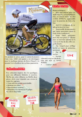 Kiwami KONA WINGS Points techniques: • Effet anti-chaleur grâce à la maille blanche; en humidifiant le tissu, on obtient même un effet «COOL EFFECT», appréciable pour les journées de forte cha- leur. • Anti-UV protégeant du so- leil sur le dos et le bras; • Non mouillé, le tissu apporte une légère protection contre le froid; sèche rapidement; • Large bande agrippante sur le bas avec pixels de silicone pour un maintien optimal de la vaste sur le bas du dos: effet «co- quille d’œuf»; • Zip intégral pour enfilage facilité et bande de protection intérieure; • Pas de poches; 129 € Un produit de pointe pour le contre-la-montre. • Design Cette veste AERO très ajustée a été développée «Kiwami» original qui donne pour la mythique épreuve de Kona (Hawaii). Ce tout son style au KONA produit fera le bonheur des cyclistes passionnés. WINGS; • Couleur : Blanc Collection SWIM Une collection inspirée des îles pacifiques pour une silhouette féminine et sportive. Maillot une pièce «Moana» ou Maillot deux pièces «Kiri» pour répondre aux envies de toutes les nageuses. • Tissu sublimé entièrement doublé; • Résistant au chlore ; • Entraînement natation ; • Relaxation à la piscine ou à la plage ; Six coloris disponible Modèle Modèle Moana Kiri 79€ 69€ 39 TRIhebdo