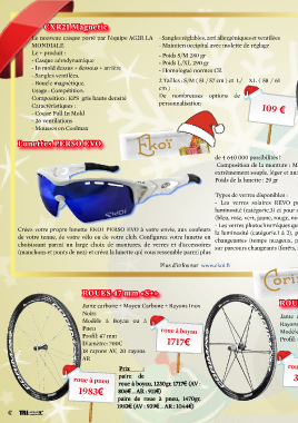 CXR21 Magnetic Le nouveau casque porté par l’équipe AG2R LA - Sangles réglables, anti allergéniques et ventilées MONDIALE - Maintien occipital avec molette de réglage Le + produit : - Poids S/M 280 gr - Casque aérodynamique - Poids L/XL 290 gr - In mold dessus + dessous + arrière - Homologué normes CE - Sangles ventilées. - Boucle magnétique. 2 Tailles : S/M ( 51 / 57 cm ) et L/ XL ( 58 / 61 Usage : Compétition. cm ) Composition : EPS gris haute densité De nombreuses options de Caractéristiques : personnalisation 109 € - Coque Full In Mold - 26 ventilations - Mousses en Coolmax Ekoï Lunettes PERSO EVO de 4 640 000 possibilités ! Composition de la monture : Monture TR90 GRILAMID de haute qualité, extrêmement souple, léger et anallergique. Poids de la lunette : 29 gr Types de verres disponibles : - Les verres solaires REVO pour se protéger par forte luminosité (catégorie.3) et pour se démarquer sur les routes (bleu, rose, vert, jaune, rouge, noir). - Les verres photochromiques qui se teintent en fonction de Créez votre propre lunette EKOI PERSO EVO à votre envie, aux couleurs la luminosité (catégorie.1 à 2), pour s’adapter aux météos de votre tenue, de votre vélo ou de votre club. Configurez votre lunette en changeantes (temps nuageux, pluvieux ou brumeux) ou choisissant parmi un large choix de montures, de verres et d’accessoires sur parcours changeants (forêts, zones d’ombre...) (manchons et ponts de nez) et créez la lunette qui vous ressemble parmi plus Corima Plus d’infos sur www.ekoi.fr ROUES 47 mm «S+» ROUES 47 mm MCC «S+» Jante carbone + Moyeu Carbone + Rayons Inox Noirs Jante carbone + Moyeu carbone + Modèle à Boyau ou à Rayons carbone Pneu roue à boyau Modèle à Boyau ou à Pneu Profil: 47 mm Profil: 47 mm Diamètre: 700C 1717€ Diamètre: 700C 18 rayons AV, 20 rayons 12 rayons AV, AR 12 rayons AR Prix : roue à pneu Prix : paire de paire de 3118€ roue à pneu roue à boyau, 1130gr, 2856€ (AV : roue à boyau, 1230gr, 1717€ (AV : 1324€ _ AR : 1532€) 1983€ 806€ _ AR : 911€) Nouveauté : paire de roue à pneu, paire de roue à pneu, 1470gr, 1370gr, 3118€ (AV : 1455€ _ AR : 1983€ (AV : 939€ _ AR : 1044€) 1663€) 42 TRIhebdo