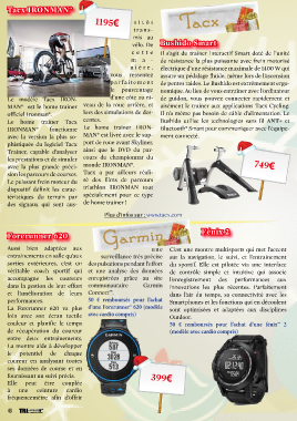 Tacx IRONMAN® 1195€ sitôt Tacx trans - mis au vélo. De Bushido Smart cette Il s’agit du trainer interactif Smart doté de l’unité ma- de résistance la plus puissante avec frein motorisé nièr e , électrique d’une résistance maximale de 1400 W qui vous ressentez assure un pédalage fluide, même lors de l’ascension parfaitement de pentes raides. Le Bushido est extrêmement ergo- le pourcentage nomique. Au lieu de vous entraîner avec l’ordinateur Le modèle Tacx IRON- d’une côte au ni- de guidon, vous pouvez connecter rapidement et MAN® est le home trainer veau de la roue arrière, et aisément le trainer aux applications Tacx Cycling. officiel Ironman®. lors des simulations de des- Il n’a même pas besoin de câble d’alimentation. Le Le home trainer Tacx centes. Bushido utilise les technologies sans fil ANT+ et IRONMAN® fonctionne Le home trainer IRON- Bluetooth® Smart pour communiquer avec l’équipe- avec la version la plus so- MAN® est livré avec le sup- ment connecté. phistiquée du logiciel Tacx port de roue avant Skyliner, Trainer, capable d’analyser ainsi que le DVD du par- les prestations et de simuler cours du championnat du avec la plus grande préci- monde IRONMAN®. 749€ sion les parcours de courses. Tacx a par ailleurs réali- Le puissant frein moteur du sé des films de parcours dispositif définit les carac- triathlon IRONMAN tout téristiques du terrain par spécialement pour ce type des signaux qui sont aus- de home trainer ! Plus d’infos sur : www.tacx.com Garmin Fénix 2 Forerunner 620 Aussi bien adaptées aux une C’est une montre multisports qui met l’accent entrainements en salle qu’aux surveillance très précise sur la navigation, le suivi, et l’entrainement sorties extérieures, c’est un des pulsations pendant l’effort du sportif. Elle est pilotée via une interface véritable coach sportif qui et une analyse des données de contrôle simple et intuitive qui associe accompagne les coureurs enregistrées grâce au site l’enregistrement des performances aux dans la gestion de leur effort communautaire Garmin innovations les plus récentes. Parfaitement et l’amélioration de leurs Connect™. dans l’air du temps, sa connectivité avec les performances. 50 € remboursés pour l’achat Smartphones et les fonctions qui en découlent La Forerunner 620 va plus d’une Forerunner® 620 (modèle sont optimisées et adaptées aux disciplines loin avec son écran tactile avec cardio compris) Outdoor. couleur et planifie le temps 50 € remboursés pour l’achat d’une fēnix™ 2 de récupération du coureur (modèle avec cardio compris) entre deux entraînements. La montre aide à développer le potentiel de chaque coureur en analysant toutes ses données de course et en fournissant un suivi précis. 399€ Elle peut être couplée à une ceinture cardio fréquencemètre afin d’offrir 46 TRIhebdo