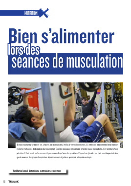 NUTRITION Bien s’alimenter lors des séances de musculation Si vous souhaitez optimiser vos séances de musculation, veillez à votre alimentation. En effet une alimentation bien conduite renforce l’efficacité de la séance de musculation (gain de puissance musculaire, prise de masse musculaire…) et facilite la récu- pération. Il faut savoir qu’on ne nourrit pas un muscle qu’avec des protéines. L’apport en glucides est tout aussi important ainsi que le moment des prises alimentaires. Vous trouverez ci-joint un protocole alimentaire simple. Par Marion Rouxel, diététicienne-nutritionniste ©overstims 62 TRIhebdo