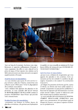 NUTRITION Tout au long de la journée, hydratez-vous régu- de qualité. Je vous conseille au minimum 50 cl par lièrement et apportez suffisamment d’énergie à heure d’effort de boisson de type HYDRIXIR AN- votre organisme. En effet si votre objectif est la TIOXYDANT OVERSTIM.s®. prise de masse, il faut rajouter des calories car la fabrication de nouveaux tissus nécessite un apport Après la séance de musculation : supplémentaire d’énergie. -pensez à une collation de récupération qui vous apporte des glucides et des protéines. Cette as- Avant la séance de musculation : sociation permet de stimuler la synthèse du gly- -ne vous entrainez pas à jeun. Si votre dernier re- cogène musculaire et de soutenir la construction pas remonte à plus de 3 heures, consommez une musculaire. collation avant l’effort pour limiter la dégradation -privilégiez les protéines de bonne qualité, source des protéines musculaires. de BCAA. Les BCAA sont trois acides aminés es- -cette collation doit apporter des glucides et des sentiels. L’organisme ne peut pas les synthétiser, il protéines. Je vous conseille 300 ml de boisson faut donc les apporter par l’alimentation. Ces trois de RENFORCEMENT MUSCULAIRE comme le acides aminés (valine, leucine et isoleucine) sont propose OVERSTIM.s® dans l’heure qui précède intéressants pour la synthèse musculaire. votre entrainement. - je vous conseille 300 ml de boisson de RENFOR- CEMENT MUSCULAIRE OVERSTIM.s® juste Pendant la séance de musculation : après votre entrainement. Si le prochain repas est -consommez une boisson de l’effort. Source de éloigné de 2 heures, vous pouvez rajouter à la bois- glucides et minéraux, elle permet une hydratation son un produit sucré. 64 TRIhebdo