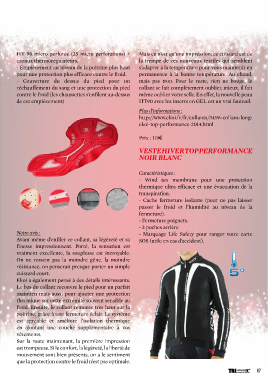 HT 90 micro perforée (35 micro perforations) + Mais ce n’est qu’une impression, ce cuissard est de canaux thermorégulateurs. la trempe de ces nouveaux textiles qui semblent - Empiècement au niveau de la poitrine plus haut s’adapter à la température pour vous maintenir en pour une protection plus efficace contre le froid. permanence à la bonne température. Au chaud, - Couverture du dessus du pied pour un mais pas trop. Pour le reste, rien ne bouge, le réchauffement du sang et une protection du pied collant se fait complètement oublier, mieux, il fait contre le froid (les chaussettes s’enfilent au-dessus même oublier votre selle. En effet, la nouvelle peau de cet empiècement) HT90 avec les inserts en GEL est un vrai fauteuil. Plus d’informations : http://www.ekoi.fr/fr/collants/3496-collant-long- ekoi-top-performance-2014.html Prix : 119€ VESTE HIVER TOP PERFORMANCE NOIR BLANC Caractéristiques : - Wind tex membrane pour une protection thermique ultra efficace et une évacuation de la transpiration. - Cache fermeture isolante (pour ne pas laisser passer le froid et l’humidité au niveau de la fermeture). - Fermeture poignets. - 3 poches arrière Notre avis : - Marquage Life Safety pour ranger votre carte Avant même d’enfiler ce collant, sa légèreté et sa SOS (utile en cas d’accident). finesse impressionnent. Porté, la sensation est vraiment excellente, la souplesse est incroyable. On ne ressent pas la moindre gêne, la moindre résistance, on penserait presque porter un simple cuissard court. Ekoi a également pensé à des détails intéressants. Le bas du collant recouvre le pied pour un parfait maintien mais aussi pour ajouter une protection thermique sur cette extrémité souvent sensible au froid. Ensuite, le collant remonte très haut sur la poitrine, grâce à une fermeture éclair. Le système est agréable et améliore l’isolation thermique en ajoutant une couche supplémentaire à vos vêtements. Sur la route maintenant, la première impression est trompeuse. Si le confort, la légèreté, la liberté de mouvement sont bien présents, on a le sentiment que la protection contre le froid n’est pas optimale. 67 TRIhebdo