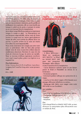 MATERIEL l’arrivée de nouveaux vêtements comme cette veste VESTE THERMIQUE TOP EKOI Waterprotect. En effet, cette Waterprotect PERFORMANCE NOIR ROUGE réussit à réunir les avantages d’une veste de pluie sans ses inconvénients. Entendez par là, qu’elle est réellement très respirante, elle ne vous étouffe pas lorsque le soleil est de sortie, et permet de rester au sec en évacuant bien la transpiration. Au sec donc lorsqu’il fait beau, mais au sec également lorsque le temps se gâte! La Waterprotect est parfaitement imperméable, même sous de fortes averses. Le corps reste sec, même après plusieurs heures de selle, tout comme les affaires dans vos poches. La poche arrière de la veste est munie d’un rabat, lui aussi imperméable. Nous avons clairement été conquis par cette veste pour sa polyvalence. Elle est bien plus qu’une simple veste de pluie et peut être utilisée dans de nombreuses situations. Fini donc le casse-tête du Caractéristiques : choix de vêtement lorsque la météo est variable. - 2 fibres différentes : Nous la trouvons d’ailleurs également excellente Wind tex membrane pour courir sous la pluie, grâce à sa légèreté et sa KILI MALTA ® et Wind respirabilité. tex MAGIC SOFT AIR pour une protection Plus d’informations : thermique ultra efficace http://www.ekoi.fr/fr/maillots-manches- et une évacuation de la transpiration. longues/3497-maillot-long-ekoi-waterprotect. - Cache fermeture isolante (pour ne pas laisser html passer le froid et l’humidité au niveau de la Prix : 139€ fermeture). - Fermeture poignets. - Col doublé polaire rallongé avec protection de la nuque. - 4 poches arrière dont 1 zippée réfléchissante avec passage câble pour téléphone ou autres…. - Marquage Life Safety pour ranger votre carte SOS (utile en cas d’accident). Les + produits : Face : Tissu Wind tex membrane KILI MALTA ® 360 gr. : - Thermique : Efficace jusqu’à -5°. - Etanche - Respirant. Dos : Insert dorsal Wind tex MAGIC SOFT AIR : permet d’évacuer la transpiration plus efficacement tout en isolant du froid. 71 TRIhebdo
