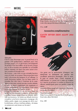 MATERIEL Plus d’informations : http://www.ekoi.fr/fr/vestes-thermiques/3495- veste-ekoi-top-performance-2014.html Prix : 169€ Accessoires complémentaires GANTS HIVER EKOI ALLOY 2014 NOIR Notre avis : C’est la veste thermique pour le grand froid de la gamme TOP performance. Annoncée pour vous protéger jusqu’à -5°, ce qui étonne c’est la légèreté du produit. Une fois enfilée, on ne la sent presque pas, et elle se montre très agréable. Le col doublé polaire remonte très haut sans pour autant créer une sensation d’étranglement. Sur la route, cette veste est une véritable barrière Ces gants ont la particularité d’intégrer une contre le froid, rien ne passe ! Tout est parfaitement membrane en aluminium qui apporte une isolé, la fermeture des poignets, le col rallongé, le excellente protection thermique. Pour le reste, cache fermeture isolant, rien ne laisse entrer le le gant est souple, léger, chaud, respirant et moindre filet d’air frais à l’intérieur de la veste. réfléchissant. La paume de la main est équipée Mais ce n’est pour autant pas une cocotte-minute, de 5 inserts en gel pour le confort et d’inserts en la veste se montre également très respirante et silicone antidérapant pour une parfaite tenue du évacue parfaitement la transpiration. Votre corps cintre. reste constamment au chaud et au sec. Annoncé efficace jusqu’à 0°, c’est le gant idéal pour A vrai dire, rien qu’à la vue de cette veste, on vos sorties hivernales. devine un fort niveau de technicité, les tissus sont Plus d’informations : travaillés, l’insert dorsal Wind tex MAGIC SOFT http://www.ekoi.fr/fr/gants-hiver/3478-gants- AIR impressionne. De nombreux détails viennent hiver-ekoi-alloy-2014.html compléter cette bonne impression, marquage Life Safety, poche zippée avec passage de câble pour Prix : 35€ le téléphone, col avec doublure polaire… Et toutes ces promesses sont tenues sur la route ! 72 TRIhebdo