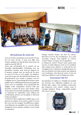 MATERIEL Déroulement du week-end Puisque Garmin France fait bien les choses, direction la remise des récompenses, avec, pour Après avoir fait connaissance avec Garmin France l’anecdote, l’équipe dans laquelle se trouvait lors de notre arrivée, il nous aura fallu nous TrimaX-hebdo, vainqueur de cet aquathlon. montrer patient une nuit de plus avant d’avoir en Le dimanche, Garmin France nous avaient tous main la nouvelle 920 XT. inscrits, en relais (distance semi) sur le marathon Après une présentation de la montre, de ses Nice-Cannes pour clôturer ce week-end de test nouvelles fonctionnalités, d’échanges avec les notamment avec la fonction running dynamics. Ce spécialistes Garmin, nous avons pu disposer de sont des données très intéressantes qui analysent la montre pendant tout un week-end. La prise votre technique, votre façon de courir, et donc un en main de la bête est très rapide, très intuitive, outil pour améliorer votre technique de course. nous n’avons pas eu le moindre besoin d’ouvrir une documentation pour réussir à naviguer entre les Forerunner 920 XT multiples menus. Paramétrage de la montre à notre En attendant de réaliser un véritable test produit profil, et nous voilà fin prêt pour un essai grandeur qui nécessite une utilisation régulière sur une nature avec un aquathlon sur la promenade des période plus longue, voici quelques nouveautés Anglais. Cette compétition réservée était une que proposent cette montre comme nous l’a première occasion de tester cette montre. Nous expliqué Jonathan Metge, responsable produit avons ainsi créé un profil aquathlon sur la 920XT, chez Garmin France. en intégrant les transitions, nous enfilons les combinaisons prêtées par Europium et direction la ligne de départ ! La 920XT se fait complètement oublier que ce soit pendant la natation ou la course à pied. En ayant bien pris soin de marquer les différentes étapes, nous finissons cet aquathlon avec tous les détails enregistrés dans la montre, natation, course à pied et transitions. 77 TRIhebdo