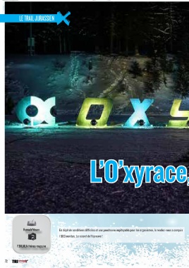 LE TRAIL JURASSIEN L’O’xyrace, la magie blanche Romuald Vinace En dépit de conditions difficiles et une poudreuse impitoyable pour les organismes, le rendez-vous a conquis 1 500 mordus. Le record de l’épreuve ! F.BOUKLA©trimax-magazine 72