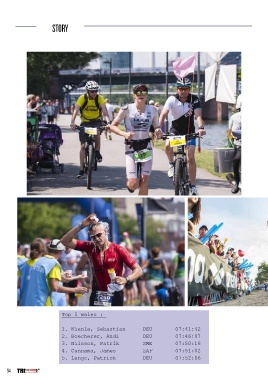 STORY Top 5 males : 1. Kienle, Sebastian DEU 07:41:42 2. Boecherer, Andi DEU 07:46:07 3. Nilsson, Patrik SWE 07:50:16 4. Cunnama, James ZAF 07:51:02 5. Lange, Patrick DEU 07:52:06 54