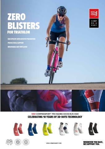 ZERO BLISTERS FOR TRIATHLON RUN SPECIFIC WITH HOTSPOT PREVENTION PROTECTION & SUPPORT BREATHABLE AND VENTILATED NEW COMPRESSPORT® PRO RACING SOCKS RUN HIGH CELEBRATING 10 YEARS OF 3D DOTS TECHNOLOGY www.compressport.com 43