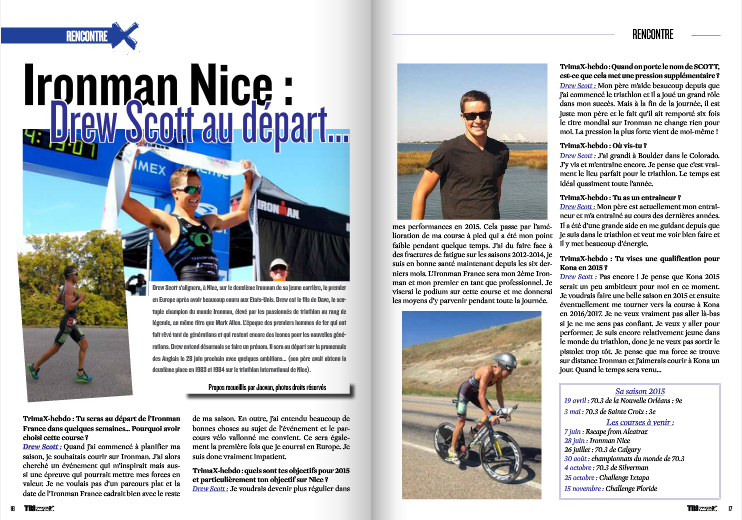 Drew Scott s’alignera, à Nice, sur le deuxième Ironman de sa jeune carrière, le premier en Europe après avoir beaucoup couru aux Etats-Unis. Drew est le fils de Dave, le sextuple champion du monde Ironman, élevé par les passionnés de triathlon au rang de légende, au même titre que Mark Allen. L’époque des premiers hommes de fer qui ont fait rêvé tant de générations et qui restent encore des icones pour les nouvelles géné- rations. Drew entend désormais se faire un prénom. Il sera au départ sur la promenade des Anglais le 28 juin prochain avec quelques ambitions… (son père avait obtenu la deuxième place en 1983 et 1984 sur le triathlon international de Nice).