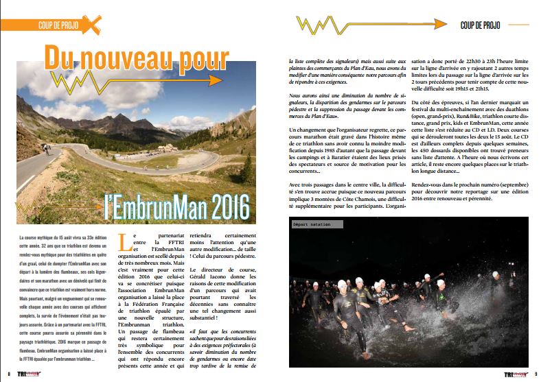 La course mythique du 15 août vivra sa 33e édition cette année. 32 ans que ce triathlon est devenu un rendez-vous mythique pour des triathlètes en quête d’un graal, celui de dompter l’EmbrunMan avec son départ à la lumière des flambeaux, ses cols légendaires et son marathon avec un dénivelé qui finit de convaincre que ce triathlon est vraiment hors norme. Mais pourtant, malgré un engouement qui se renouvelle chaque année avec des courses qui affichent complets, la survie de l’événement n’était pas toujours assurée. Grâce à un partenariat avec la FFTRI, cette course pourra assurée sa pérennité dans le paysage triathlétique. 2016 marque ce passage de flambeau. EmbrunMan organisation a laissé place à la FFTRI épaulée par l’embrunman triathlon …