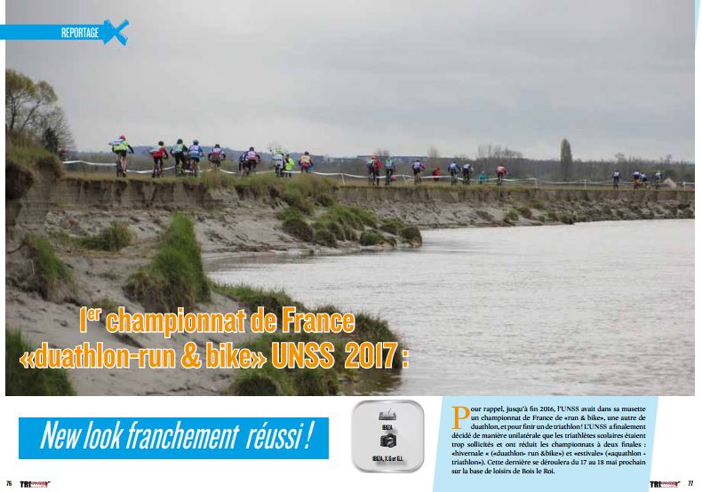 Pour rappel, jusqu’à fin 2016, l’UNSS avait dans sa musette un championnat de France de «run & bike», une autre de duathlon, et pour finir un de triathlon ! L’UNSS a finalement décidé de manière unilatérale que les triathlètes scolaires étaient trop sollicités et ont réduit les championnats à deux finales : «hivernale « («duathlon- run &bike») et «estivale» («aquathlon – triathlon»). Cette dernière se déroulera du 17 au 18 mai prochain sur la base de loisirs de Bois le Roi.