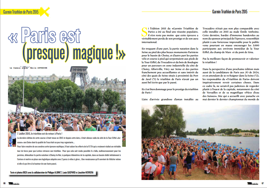 7 Juillet 2015, le triathlon est de retour à Paris ! La dernière édition de cette course s’était tenue en 2012 et depuis cette date, c’était silence radio du côté de la Tour Eiffel «because» une Seine dont la qualité de l’eau était un peu trop ragoutante… Pour faire renaitre de ses cendres cette épreuve mythique, il faut saluer les efforts de la F.F.Tri qui a vraiment réalisé un véritable tour de force pour que Lutèce retrouve son triathlon. Pour que cela soit rendu possible il a fallu, malheureusement pour les puristes, délocaliser la partie natation à Choisy-le-Roi, à quelques kilomètres de la capitale, dans un bassin dédié initialement à l’aviron et mettre en place une logistique adaptée avec 2 parcs à vélos à gérer… Une renaissance qu’il convient de féliciter même si elle n’a pu être à la hauteur de son faste passé.