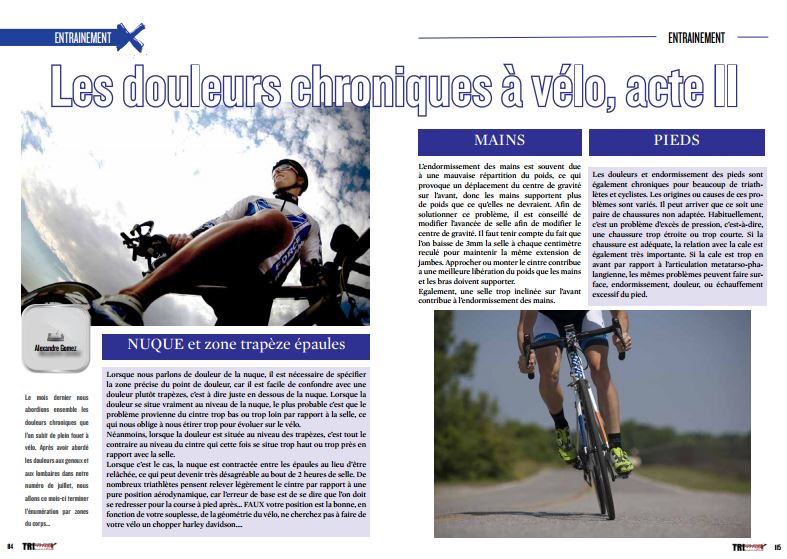 Le mois dernier nous abordions ensemble les douleurs chroniques que l’on subit de plein fouet à vélo. Après avoir abordé les douleurs aux genoux et aux lombaires dans notre numéro de juillet, nous allons ce mois-ci terminer l’énumération par zones du corps…