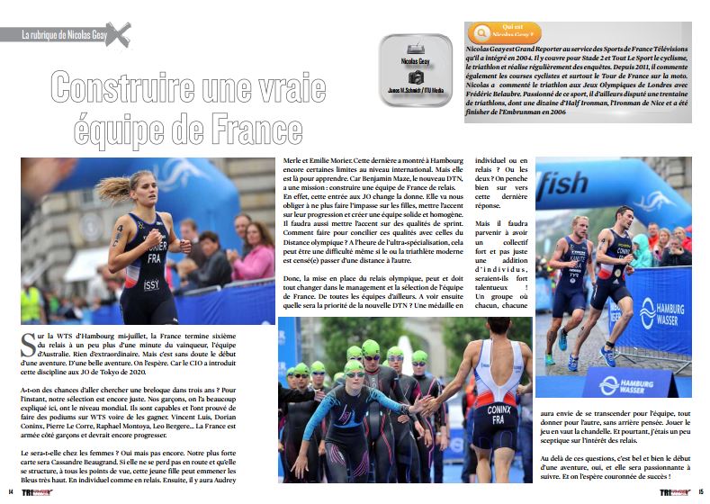 Sur la WTS d’Hambourg mi-juillet, la France termine sixième du relais à un peu plus d’une minute du vainqueur, l’équipe d’Australie. Rien d’extraordinaire. Mais c’est sans doute le début d’une aventure. D’une belle aventure. On l’espère. Car le CIO a introduit cette discipline aux JO de Tokyo de 2020.