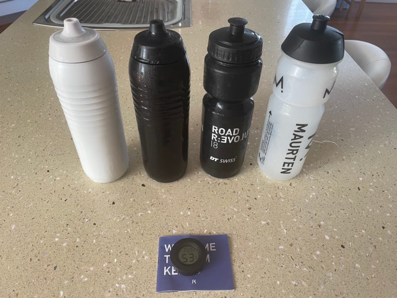 La bouteille est en forme de triangle inversé, passant de 79 mm en haut à 72 mm dans sa partie basse pour être utilisable avec les portes-bidons standard. L’ouverture est d’un diamètre de 46 mm, soit 2 mm plus large que ma bouteille Maurten de référence fabriquée par Tacx (44 mm), mais 8 mm plus petite que la bouteille noire DT Swiss faite à Taïwan.