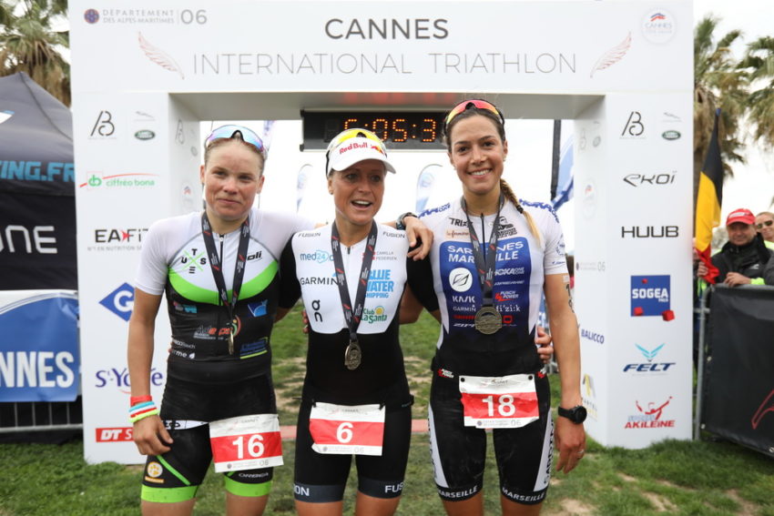 Dans la course féminine, Charlotte Morel sort en tête de la natation mais les favorites sont dans son sillage ! Et c’est la Suissesse Emma Bilham qui prend les commandes de la course à vélo suivie à moins d’une minute par Camilla Pedersen, Margie Santimaria et Justine Guerard.