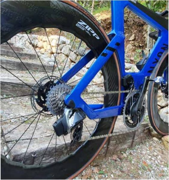 À cadre d’exception, équipements d’exception. Pour notre version test, le Speedmax CFR est équipé du groupe Sram eTap AXS 2x12V, intégrant un capteur de puissance. Nous ne nous étendrons pas sur la qualité du groupe qui se montre évidemment à la hauteur… comme le serait tout autant le haut de gamme de chez Shimano. À ce niveau, le choix du groupe nous semble plutôt se faire au niveau des préférences des uns et des autres, puisque dans tous les cas cela ne devrait que peu influencer sur vos performances. Même remarque pour les roues et sans n’avoir rien à reprocher à cette magnifique paire de Zipp 858 NSW, il se peut qu’en fin de compte une paire de roues plus polyvalente soit mieux adaptée à votre pratique ou votre terrain de jeu. Donc oui, rien à signaler avec ces Zipp 858 NSW et vous en aurez pour votre argent. À vous de voir si vous aurez l’utilité d’une jante haute de 80 mm à l’avant…