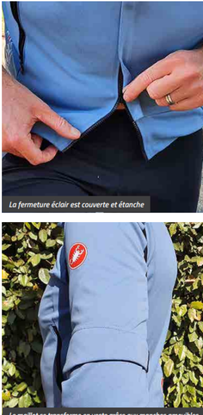 On salue donc la conception de cette veste : l’idée est bonne, la réalisation encore meilleure ! Les manches sont parfaitement intégrées à la veste, le zip étant parfaitement protégé du vent et de la pluie. Mettre ou enlever les manches se fait sans aucune difficulté. La mission est donc parfaitement remplie côté Castelli.