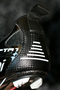 Une fois le tour du propriétaire effectué, il est temps d’enfiler ces TR1. Le revêtement intérieur se révèle assez doux et confortable. L’ajustement se fait en deux points. Tout d’abord un système de serrage par disque sur l’avant du pied. Pas de Boa ici, mais une solution concurrente, Atop. On serre dans en tournant vers l’avant, on débloque le système en tournant vers l’arrière. Le seul petit inconvénient est que si vous avez serré un petit peu trop, vous ne pouvez pas desserrer juste le nécessaire, il faut débloquer complètement puis resserrer. Pour le serrage principal, et afin de garantir en temps d’enfilage plus rapide, on retrouve un serrage par sangle muni d’un grand scratch. La chaussure peut donc être grande ouverte pour l’enfilage puis très rapidement refermée. Si vous avez le pied fin, il est possible de recouper l’extrémité de la sangle pour qu’elle ne vienne pas frotter contre vos manivelles.