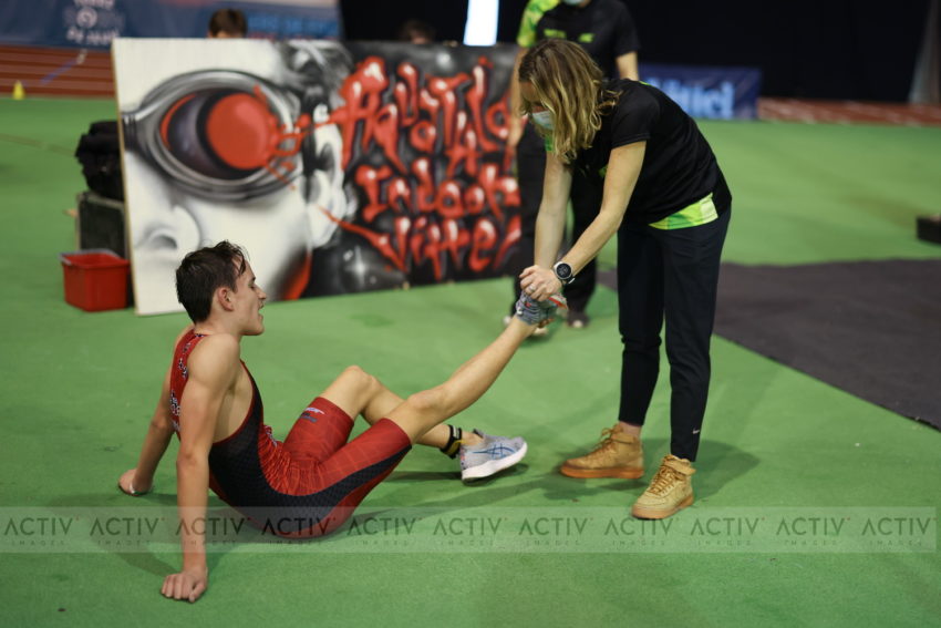 – Équilibre : l’athlète passe d’une position horizontale avec des rotations de tête à une position verticale avec une fixation plus importante de la position de la tête. Ce remaniement postural induit des déséquilibres transitoires (titubation, chute…).