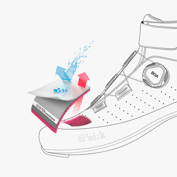 Routes mouillées, sentiers enneigés et températures glaciales… Rouler l’hiver comporte ses propres défis et c’est pourquoi Fizik a développé l’Artica GTX, sa paire de chaussure la plus chaude, mais aussi la plus imperméable. La Tempo Artica GTX fait face aux pires conditions de cette saison “ingrate” qu’est l’hiver pour la plupart des cyclistes. Ce modèle, Fizik l’a créé en collaboration avec le leader historique incontesté de la membrane imperméable et respirante : GORE-TEX.
