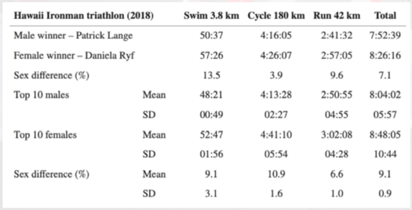 Dans un article publié en 2019, Romuald Lepers, chercheur spécialisé en triathlon, a montré que la différence entre hommes et femmes sur le chrono final était de 9,1 % en moyenne au sein du top 10 de l’Ironman World Championship 2018. La différence la plus importante étant en vélo (10,9%) et la moins importante en course à pied (6,6%).