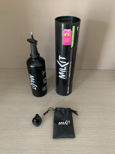 Le Milkit Booster se compose d’une bouteille en aluminium (600 ou 750 ml), d’un bouchon en caoutchouc, d’une tête de pression booster et d’un sac de rangement. Découvert en 2018 au salon de l’Eurobike, où il avait reçu un Gold Award pour son innovation, nous mourrions d’impatience d’en faire l’acquisition. De plus, le compresseur “bon marché” du vélociste le plus proche n’a parfois pas assez de pression pour plaquer les flancs des pneus tubeless contre les parois internes des jantes, rendant l’étanchéité impossible. Le Booster ne vous décevra pas. Il ne se dégonflera pas devant la tâche… Assurez-vous simplement de vous entraîner à l’avance et de confirmer qu’il fonctionnera avec votre combinaison pneu-valve-pompe avant de partir.