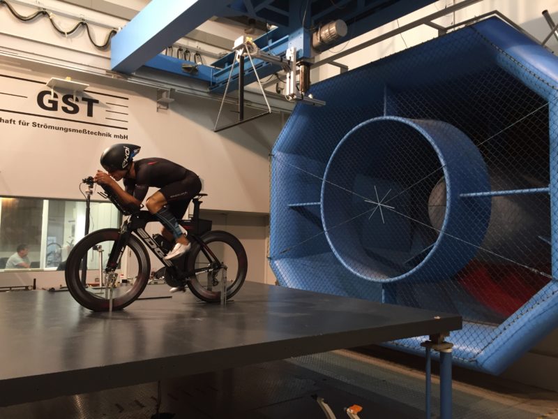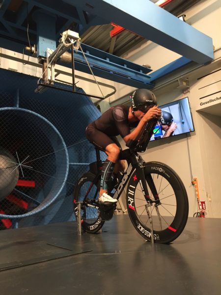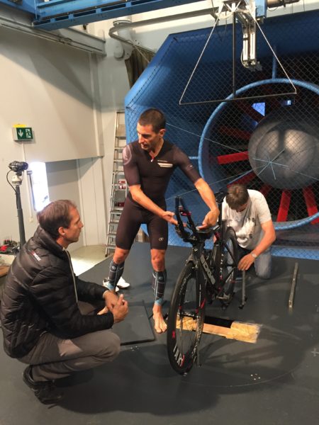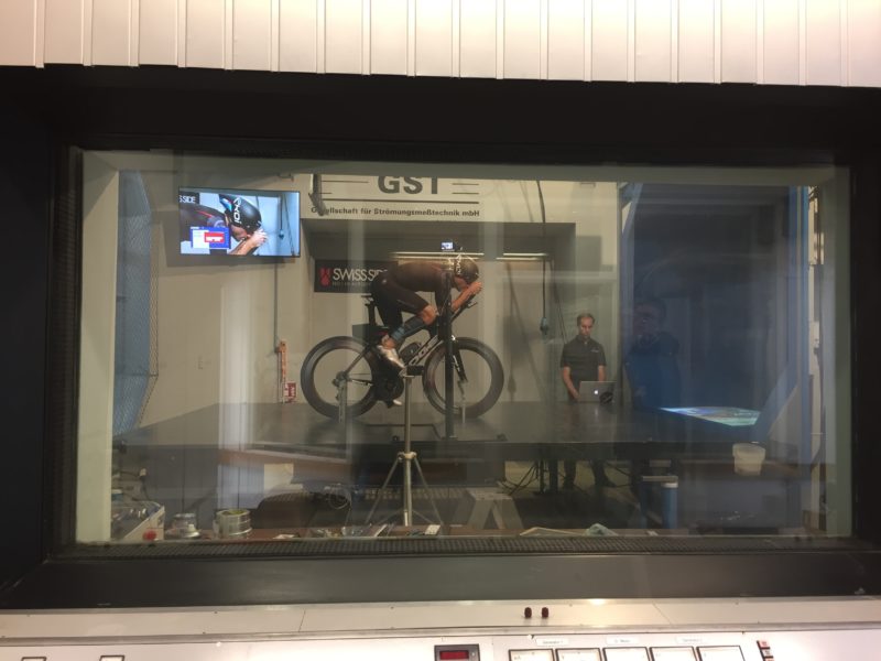 En soufflerie, les tests ont confirmé ceux obtenus sur le terrain. Les 2 positions sont très aéros. Cependant, la position praying mantis n’a pas une très bonne répétabilité (+/- 2,5 watts). Cela est confirmé par l’outil développé par Swiss Side, le système à râteaux de mesure des pressions, importé du monde de la Formule 1.
