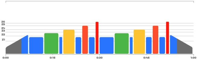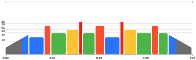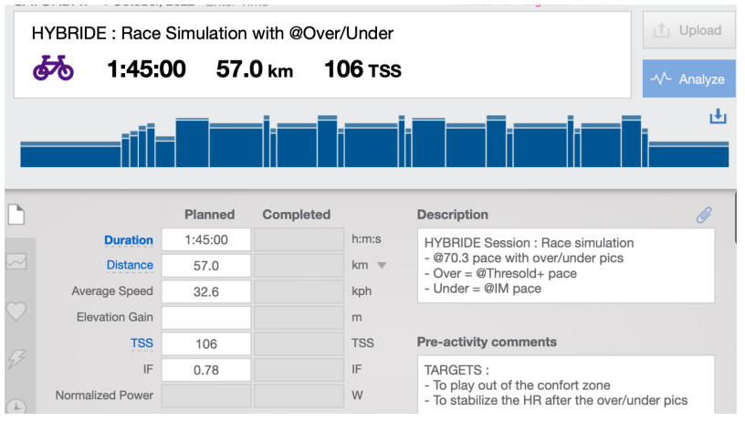 Comme évoqué plus tôt, nous utilisons également le modèle hybride pour permettre à nos athlètes de se rapprocher des conditions réelles de course. Restez sur le vélo et clipsez vos pédales ! L’exemple de séance hybride type course comme ci-après s’inspire du fractionné Moneghetti, durant lequel les phases de récupération se font sur une intensité dite ‘’tempo’’.